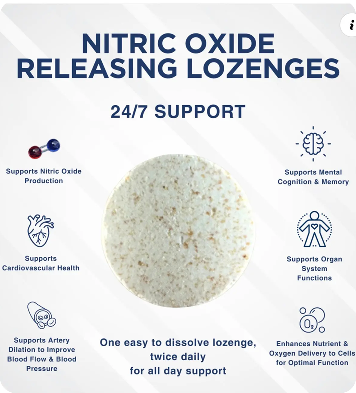 Gently move the lozenge above the tongue as it dissolves, allowing nitric oxide activation through the oral pathway.