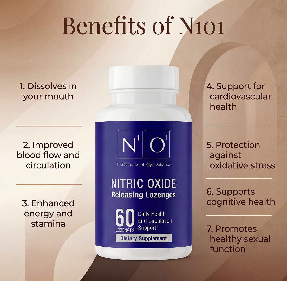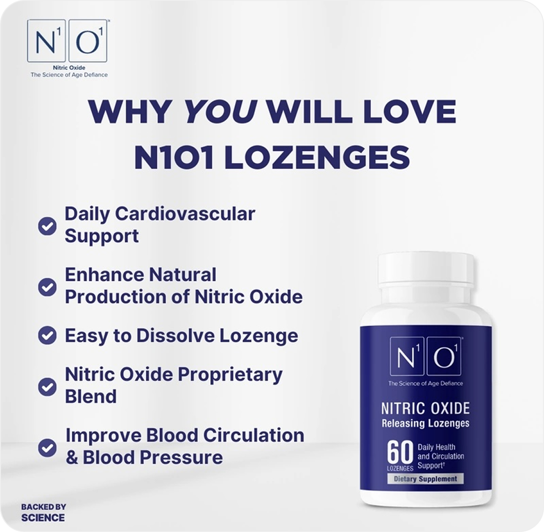 N101 Nitric Oxide Lozenges are designed to support healthy circulation through precise nitric oxide generation, helping improve oxygen delivery and tissue nourishment during recovery and daily longevity routines.