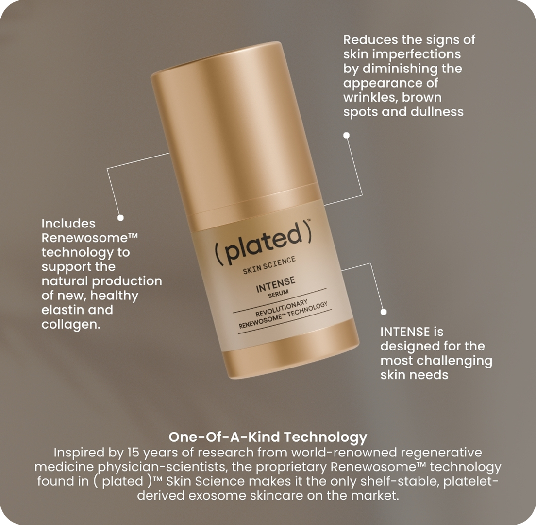 Plated® Intense utilizes platelet-derived Renewosome™ exosomes, an advanced delivery system designed to support rapid cellular communication during the skin’s recovery process.